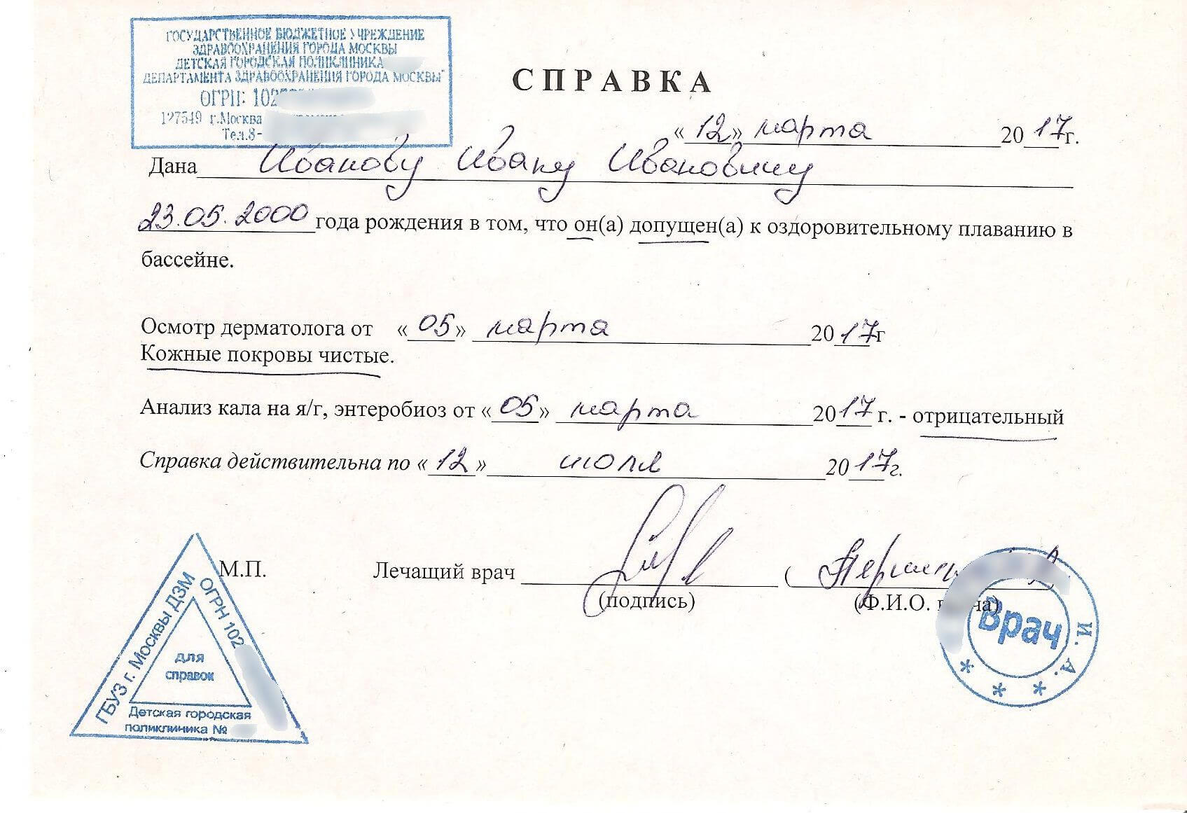 После этого справка в бассейн заверяется, доктор ставит печать и подпись. В нашем медицинском центре оформить документ легко, без посещения врача.